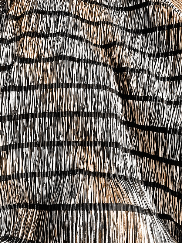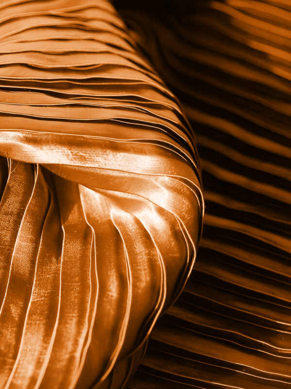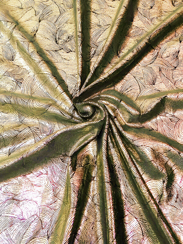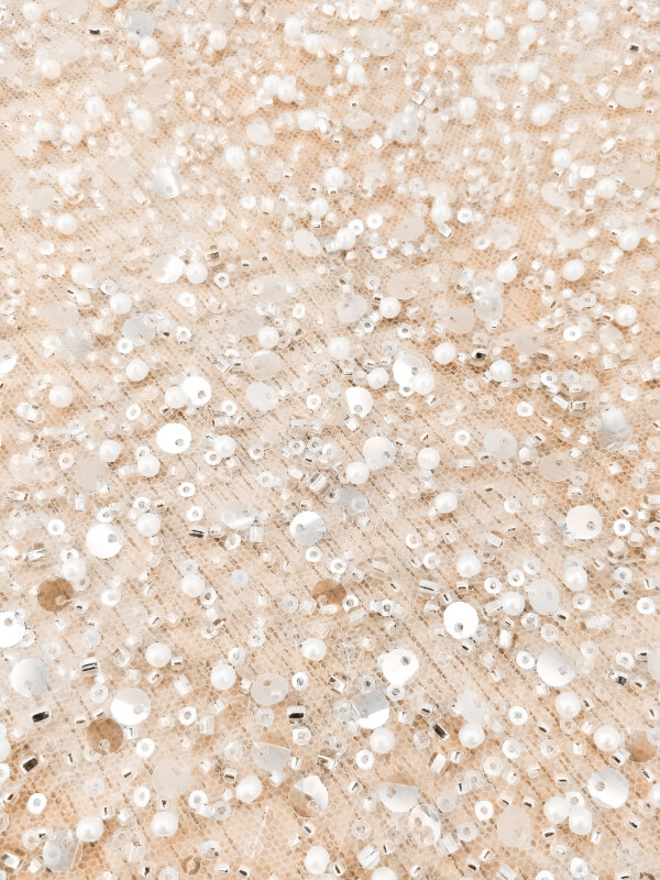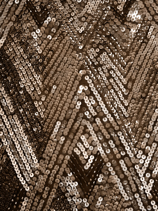 Using shrinking yarns and chemical embossing to create raised surface interests, bubbles, and crinkles that give the fabric a unique tactile quality. Capturing light and attention. We specialize in micro-sequins, reversible (flip) sequins, and all-over pave embellishments for high-octane party wear. Metallic Foils