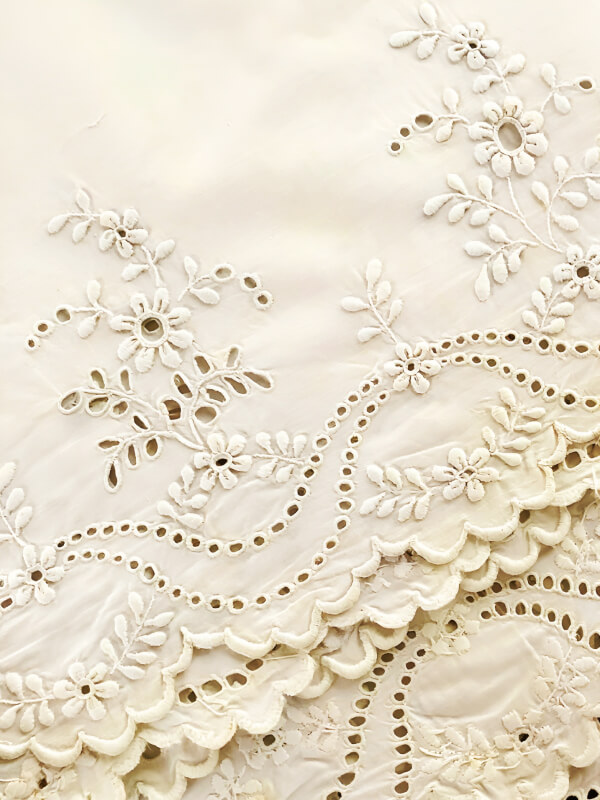 Intricate, lace-like embroidery created on massive scales. Our Schiffli capabilities allow for eyelet patterns Broderie Anglaise) and complex all-over floral designs that add high value to basic wovens.